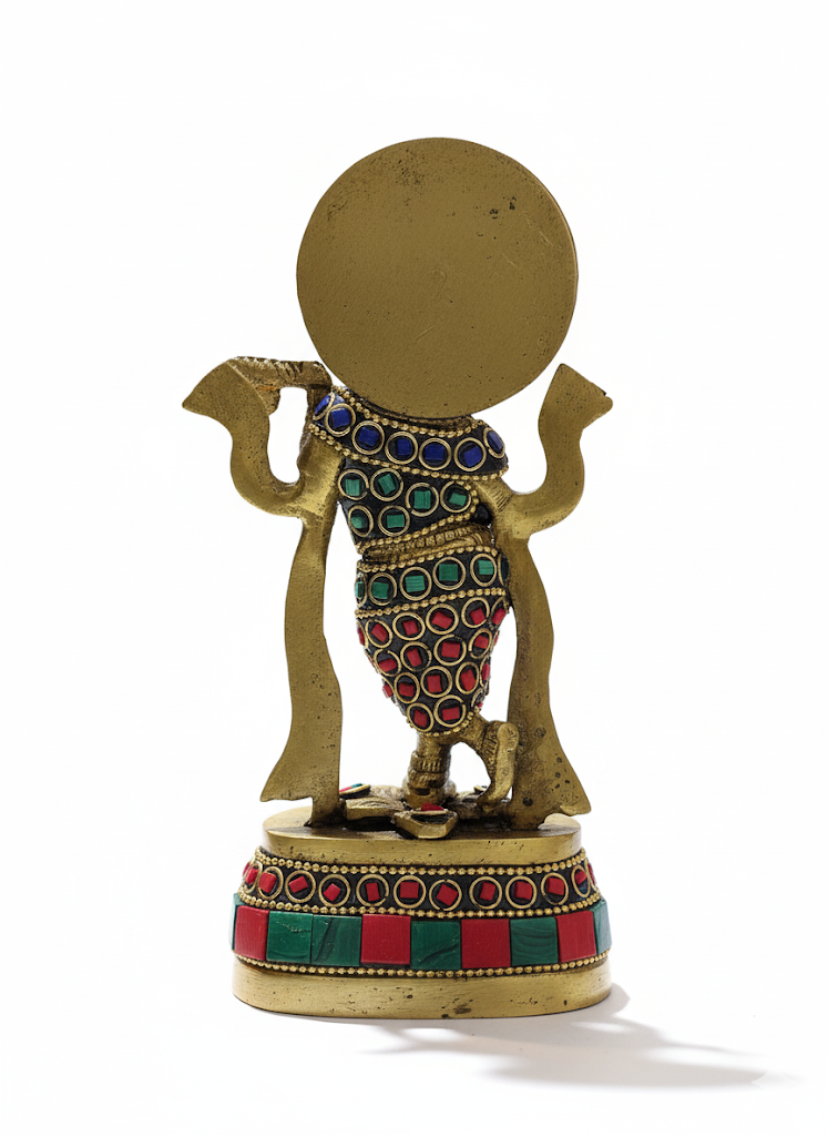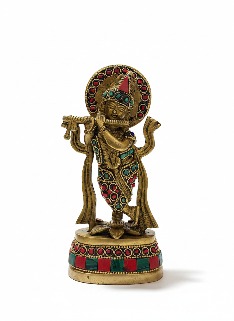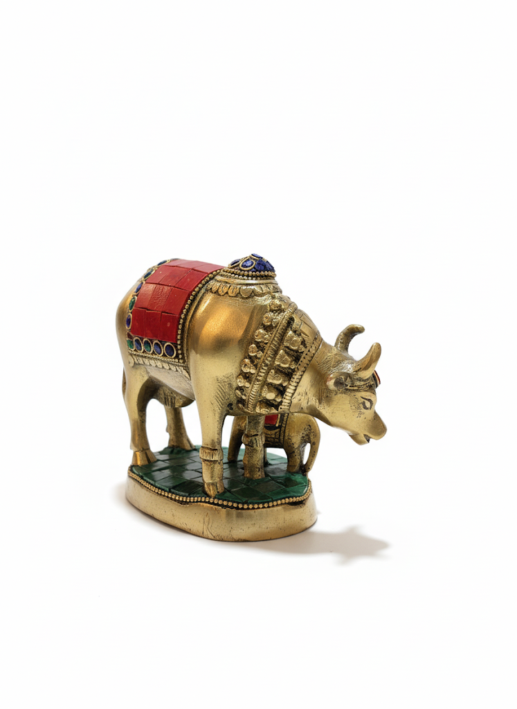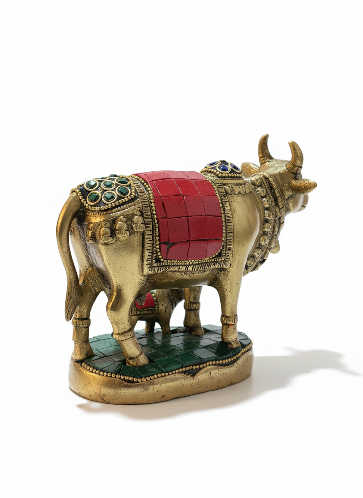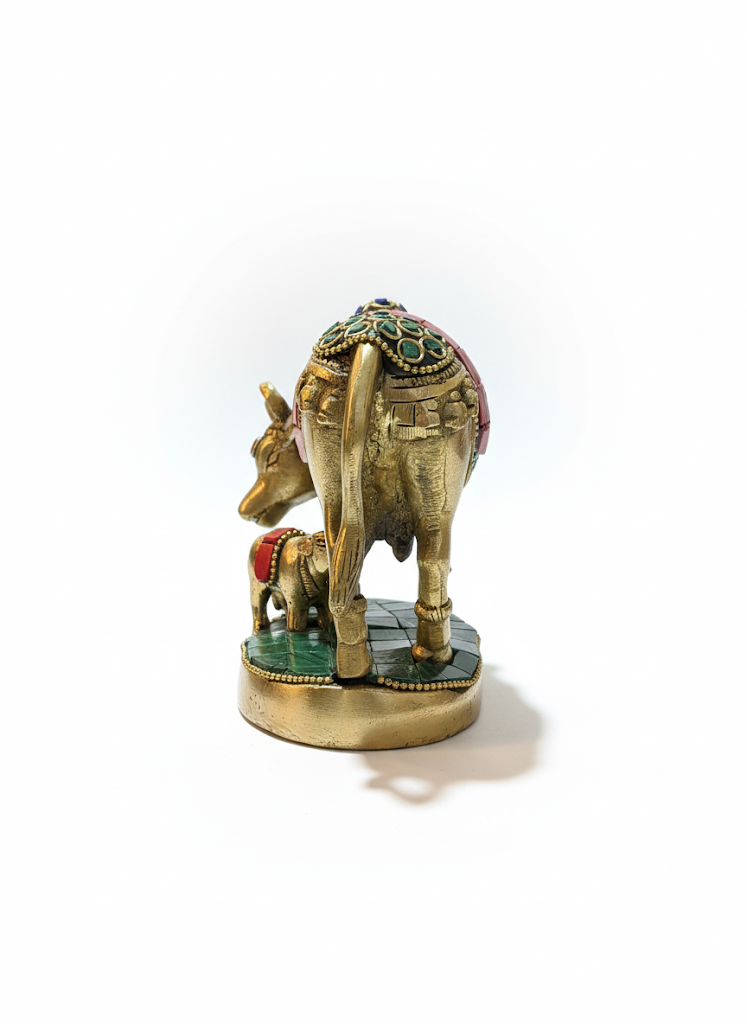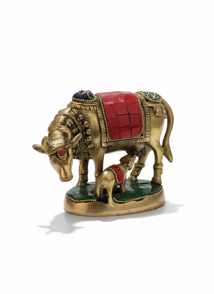 This beautifully handcrafted brass idol features Lord Krishna playing the flute alongside Kamdhenu cow and calf, symbolizing divine love, prosperity, and nurturing energy. Accented with vibrant traditional enamel work, it makes an elegant addition to your home temple, living space, or a meaningful spiritual gift.
