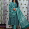 Timeless black and ivory kurta set featuring intricate ethnic prints, paired with matching pants and a beautifully striped dupatta. Crafted from soft, breathable fabric, this elegant ensemble is perfect for festive occasions, cultural events, and sophisticated everyday ethnic wear.