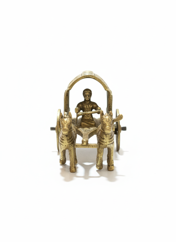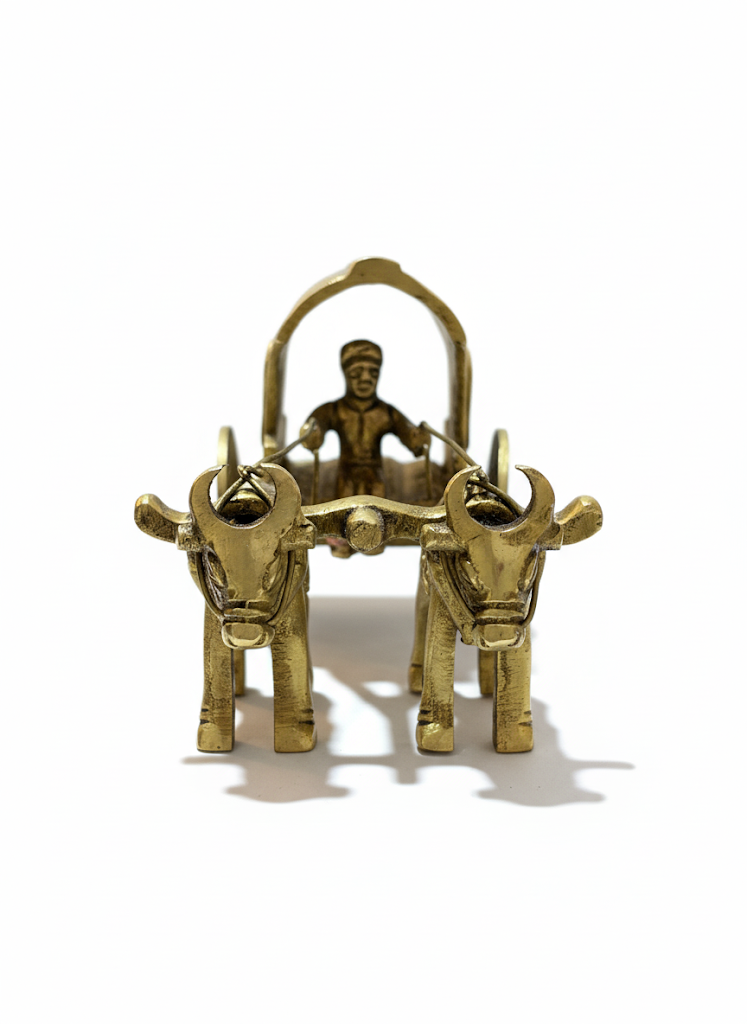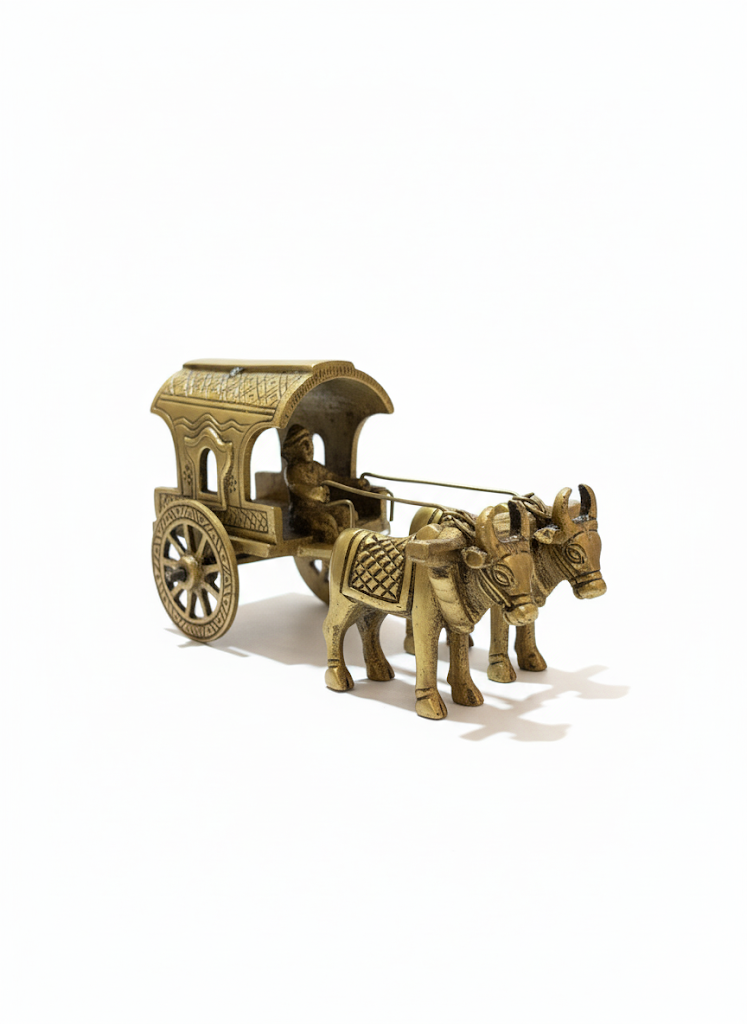 A finely detailed handcrafted brass bullock cart figurine that captures the charm of traditional rural life. Featuring intricate carvings of the cart, oxen, and driver, this timeless decor piece adds cultural warmth and heritage appeal to your home, office, or gift collection.