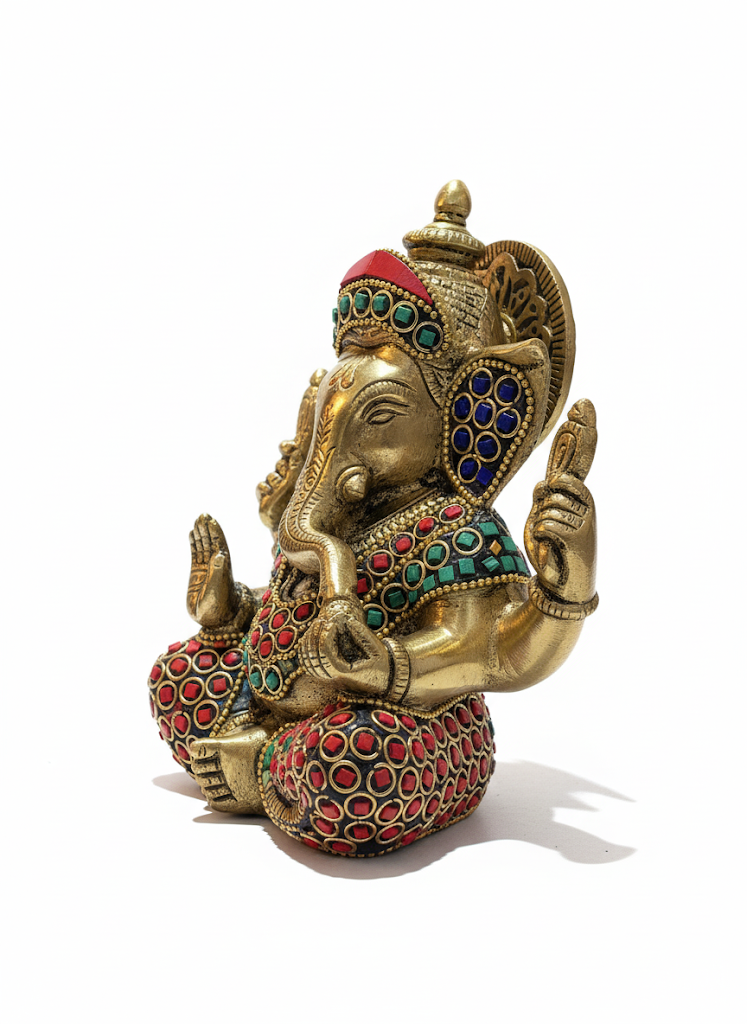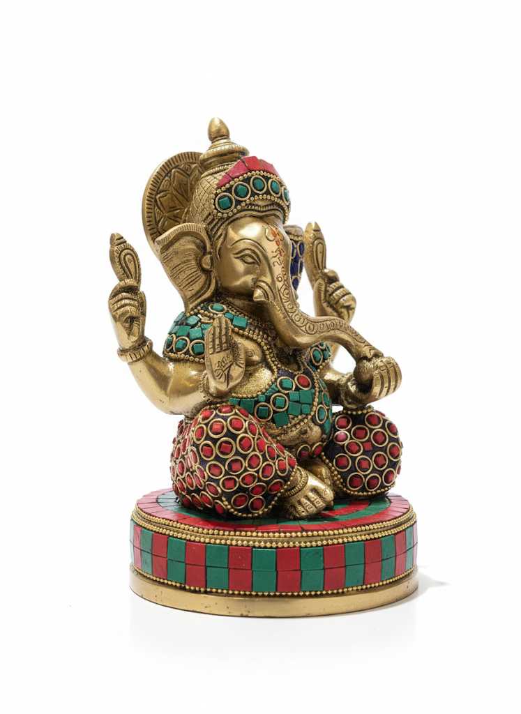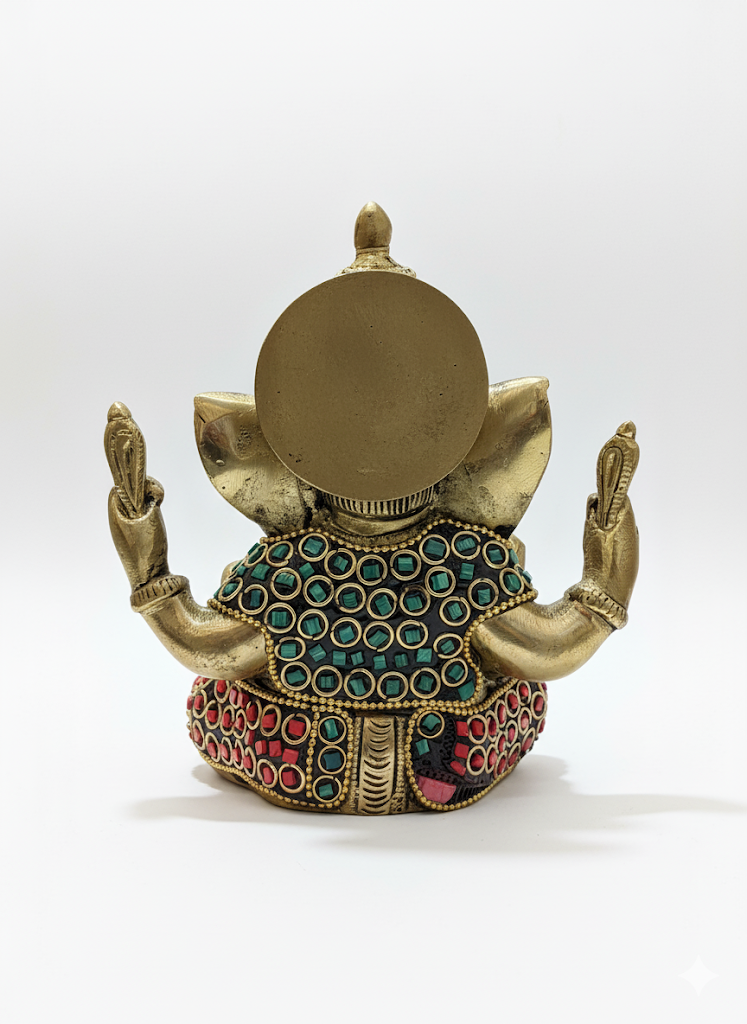 Bring prosperity and positivity to your space with this beautifully handcrafted brass Lord Ganesha statue. Adorned with intricate red, green, and blue stone inlay work, the idol showcases fine detailing and a traditional finish. Ideal for home temples, living room décor, or gifting, this statue symbolizes wisdom, success, and the removal of obstacles. A timeless spiritual décor piece crafted by skilled artisans.